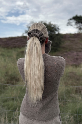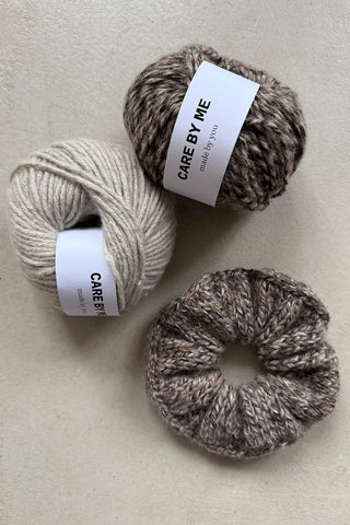 Forkæl dig selv med et lille kreativt åndehul, og strik din egen skønne scrunchie i vores bløde, genanvendte luksusgarn fra Italien. Et nemt og hyggeligt projekt, der på få timer forvandler lidt garn til en tidløs og smuk håraccessory – og inviterer til en stille, selvkærlig stund, hvor tempoet sænkes.