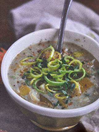 Dryp med lidt jomfruolivenolie og pynt med porreringe og timian.