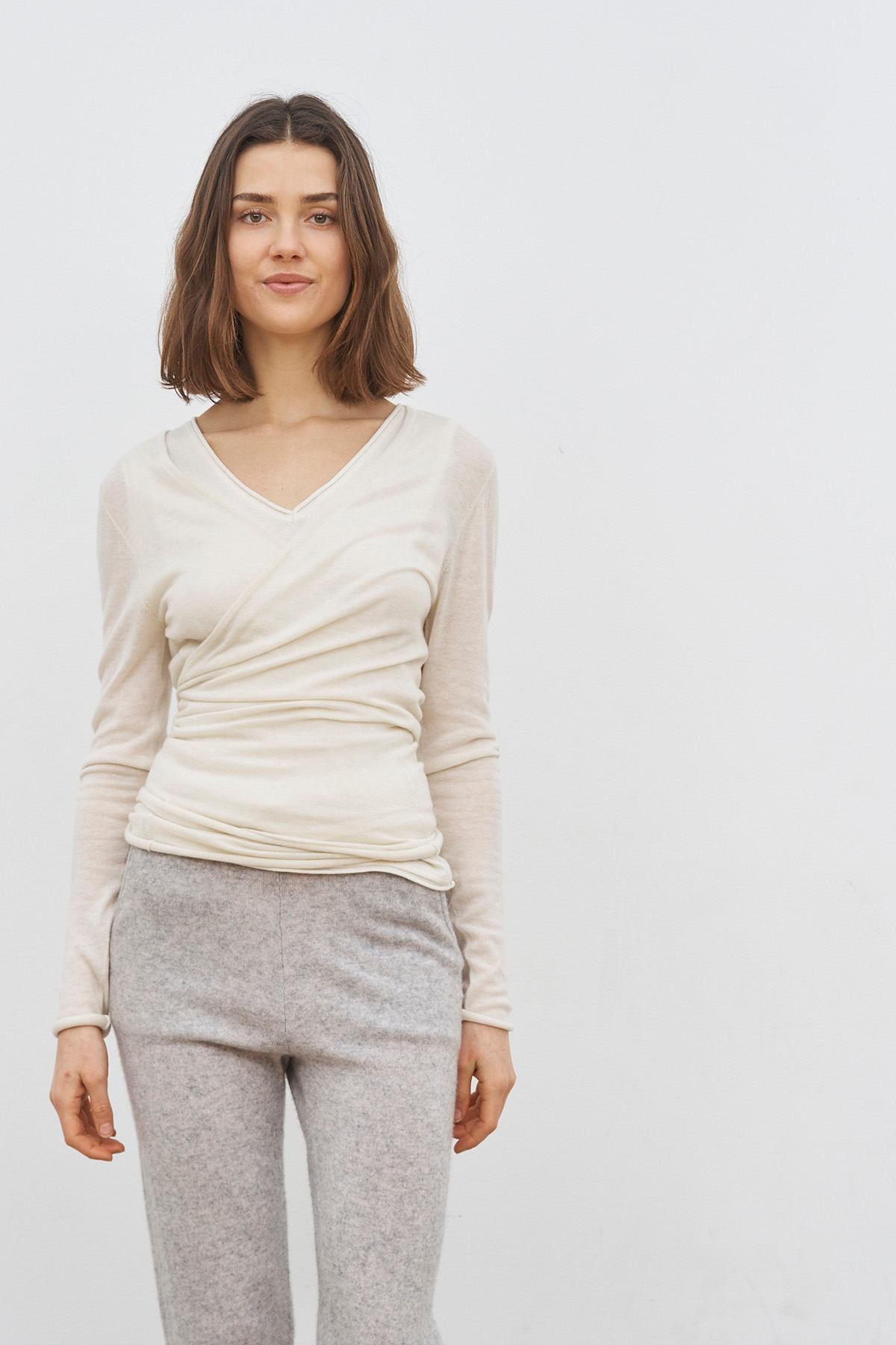 Den langærmede slå-om-bluse er skabt i ren, luksuriøs cashmere – den fineste og mest eksklusive kvalitet, man kan forestille sig.