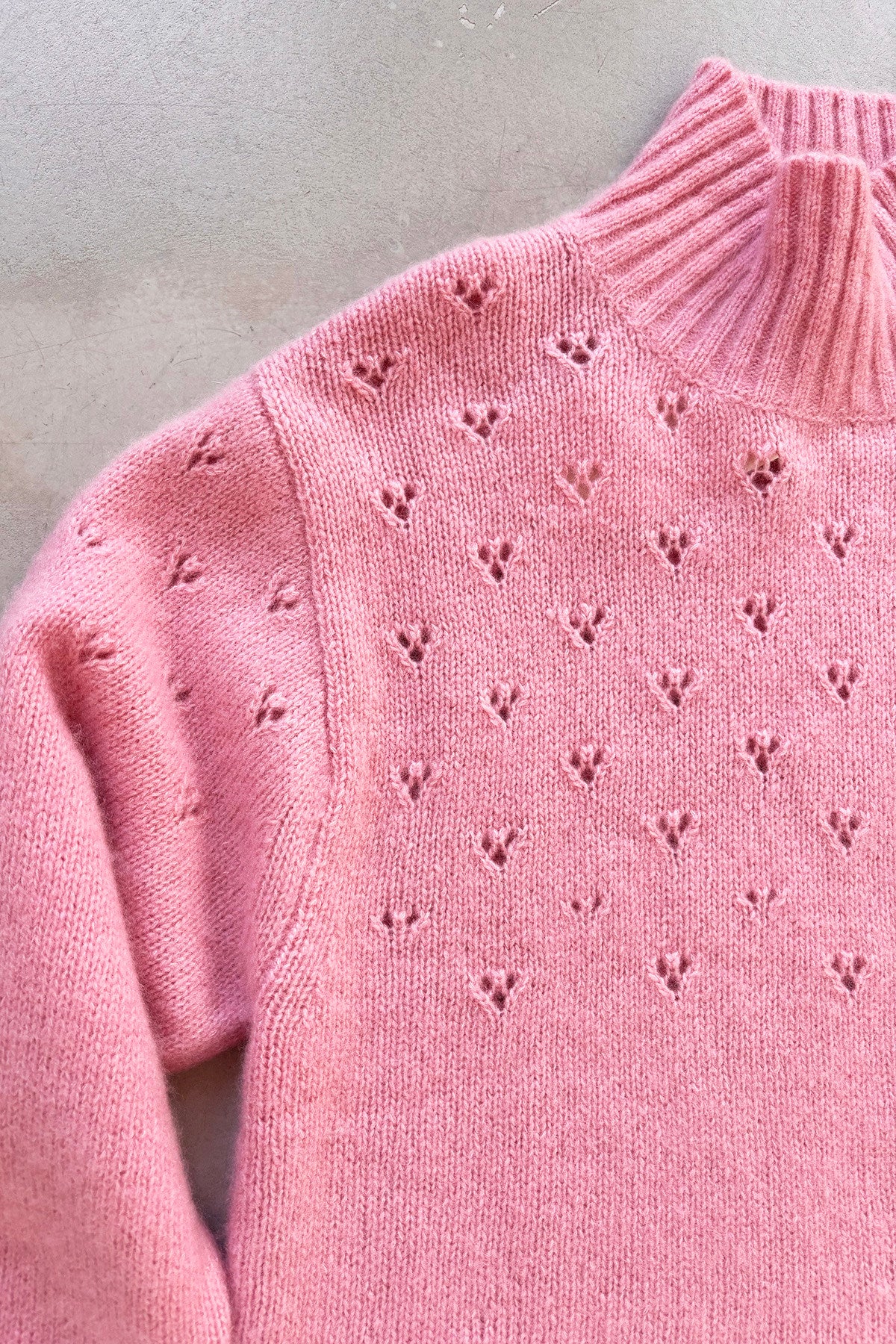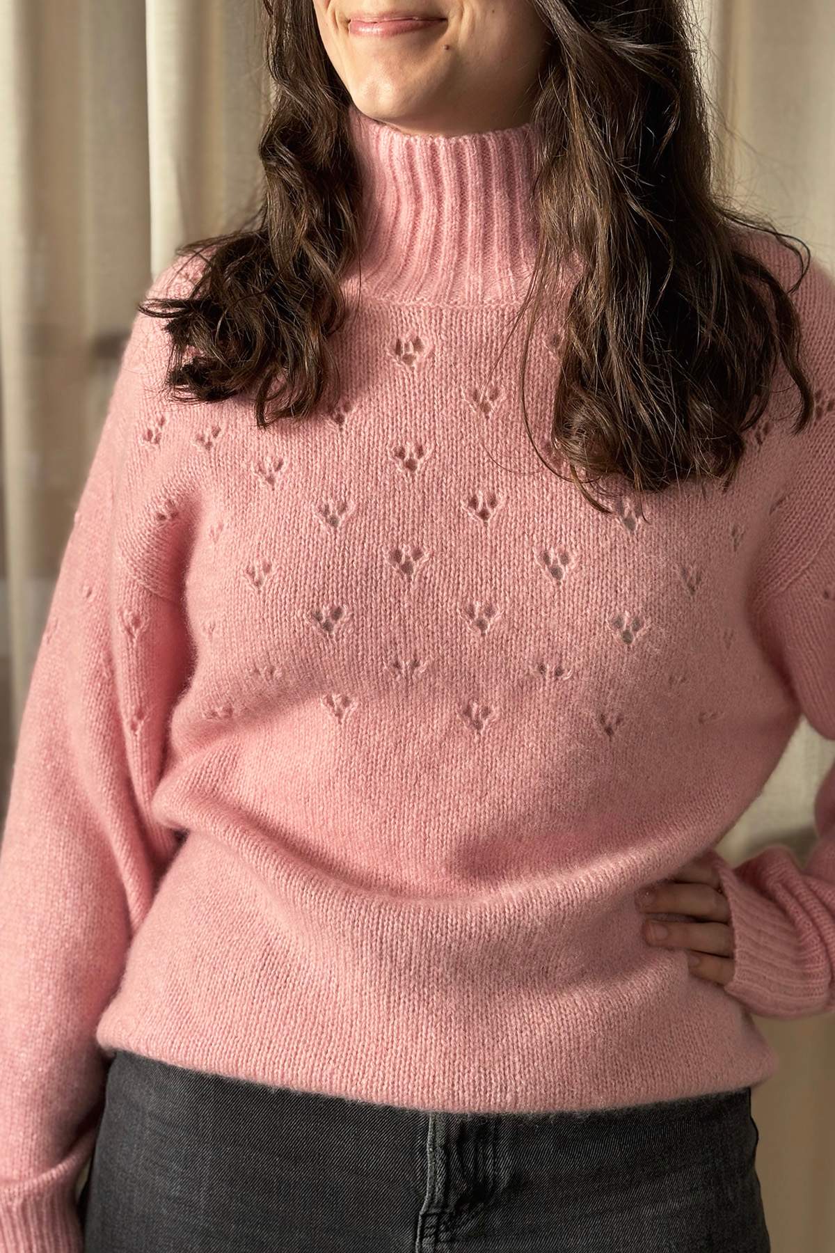 Sweateren har et smukt, feminint mønster, høj hals, lange ærmer og ribkanter.