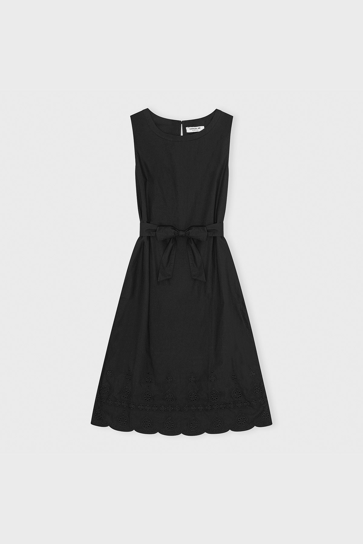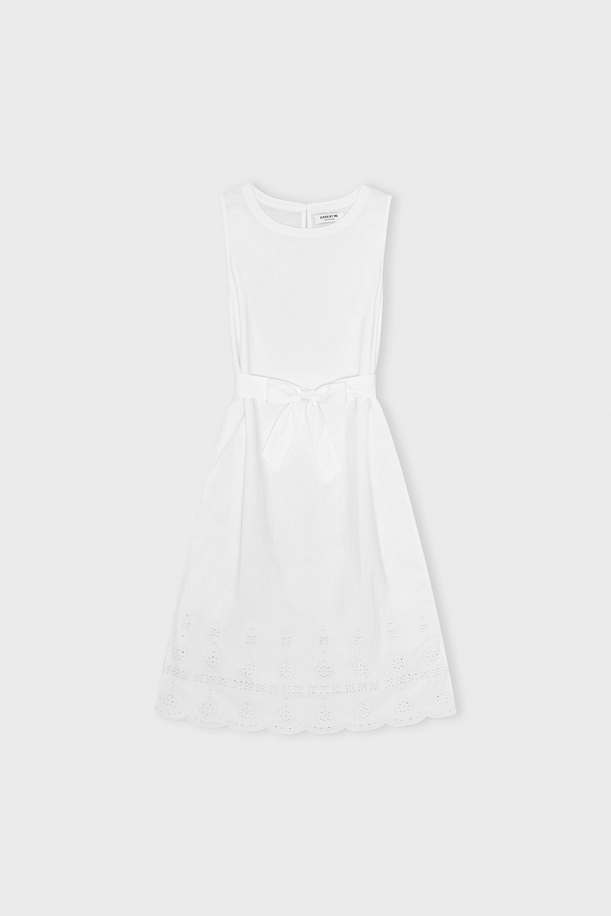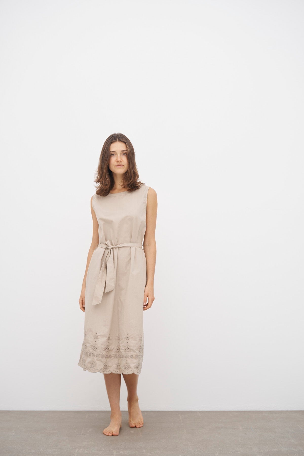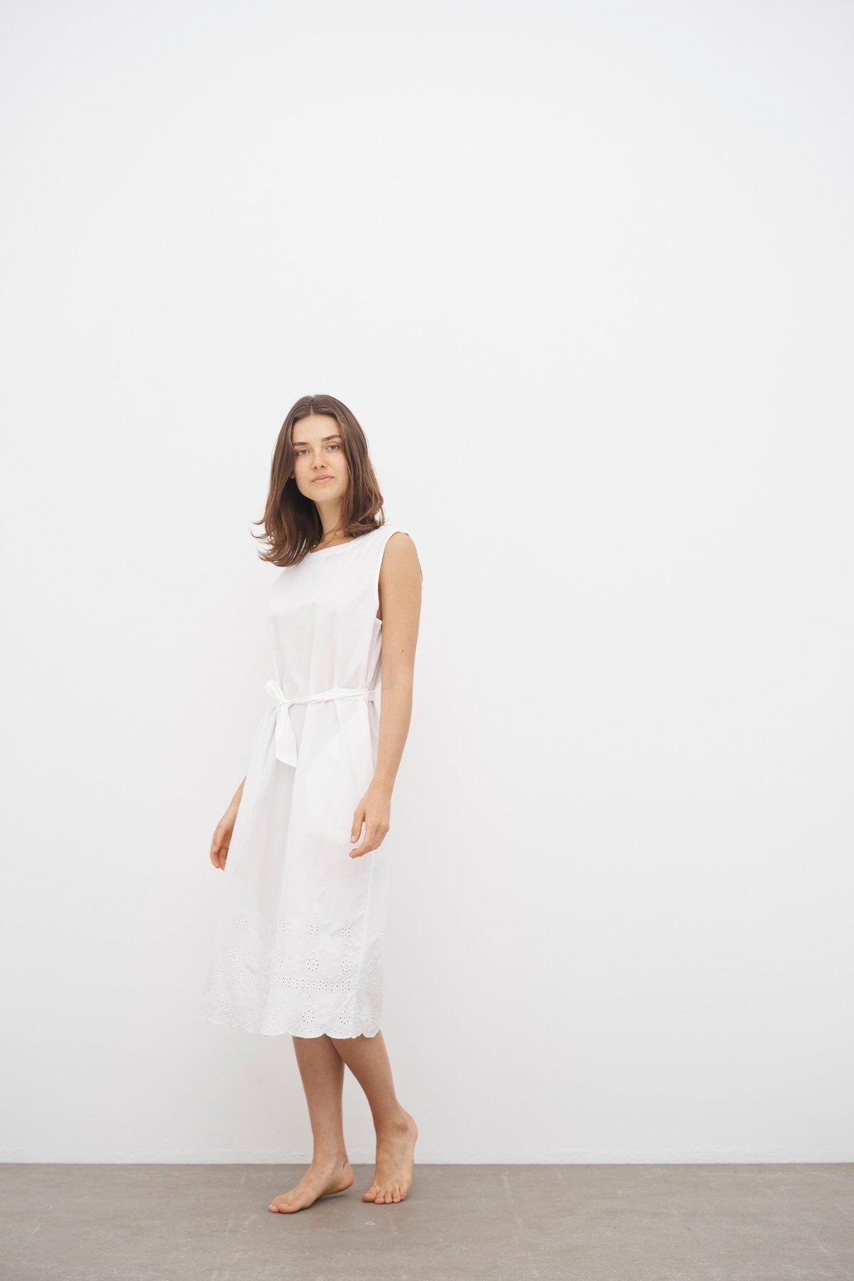 Smuk kjole i A-facon fra Flora-serien, fremstillet i økologisk bomuld med et elegant og sjæleligt broderie anglaise-mønster.